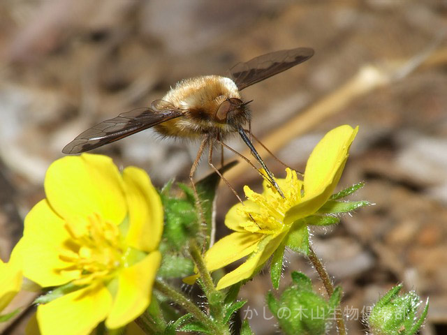 キジムシロにはビロードツリアブがやって来ました。