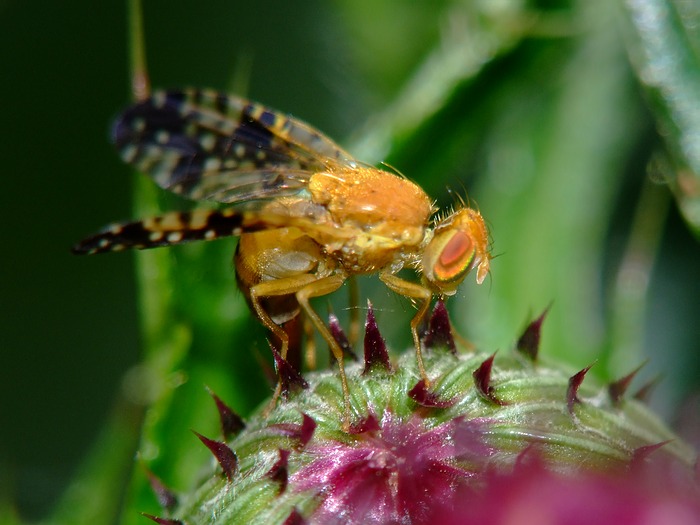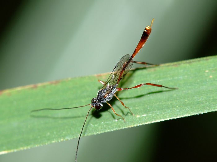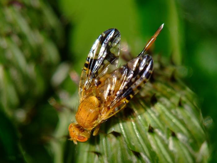 その産卵管をノアザミの蕾に刺し、卵を産みつけていました。