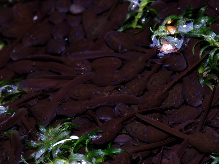 足が伸びて動きが鈍くなったアズマヒキガエルのオタマジャクシは、池の底や水草の上で固まってじっとしていました。