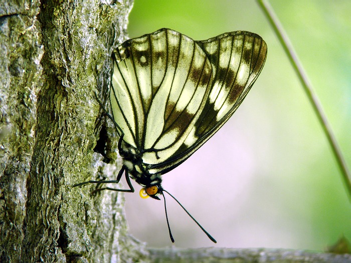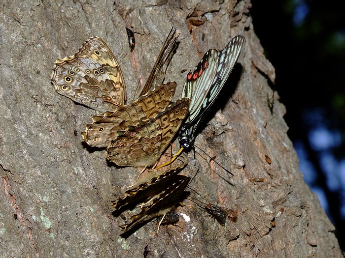 左奥は在来種のゴマダラチョウ。複眼が茶色。