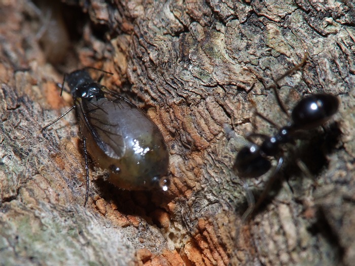 このクヌギクチナガオオアブラムシが、お尻から蜜を出すと、