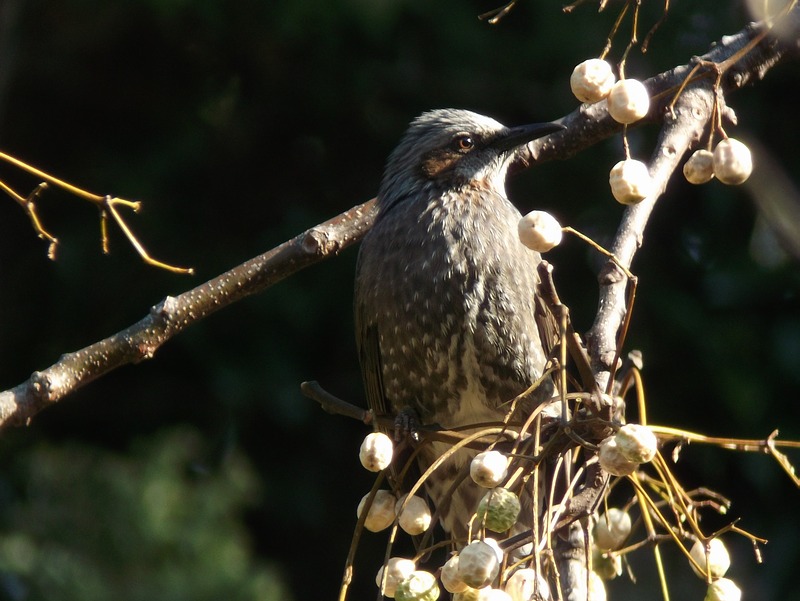 ヒヨドリがセンダンの実を勢いよく食べています。