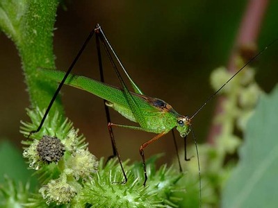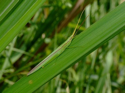 背の低い草原ではバッタの仲間が多く見られますが、ウマオイ、アシグロツユムシといったキリギリスの仲間は背の高い草叢でなければ見られません。